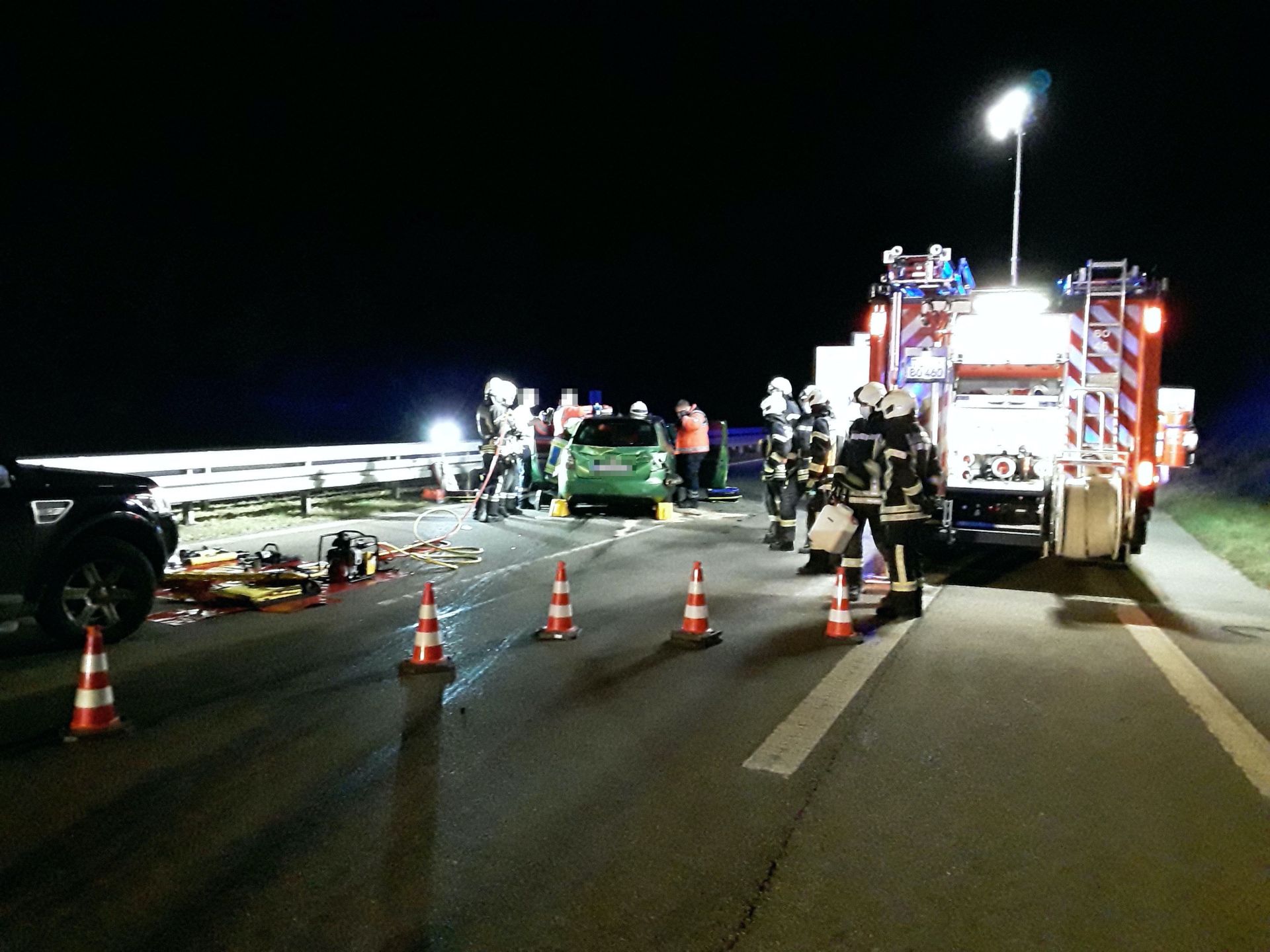 Maßnahmen: Die Feuerwehr leuchtete die Einsatzstelle großräumig aus, sicherte den Brandschutz und bereitet in Absprache mit dem Notarzt die technische Rettung des schwer verletzten Fahrers aus dem PKW vor.